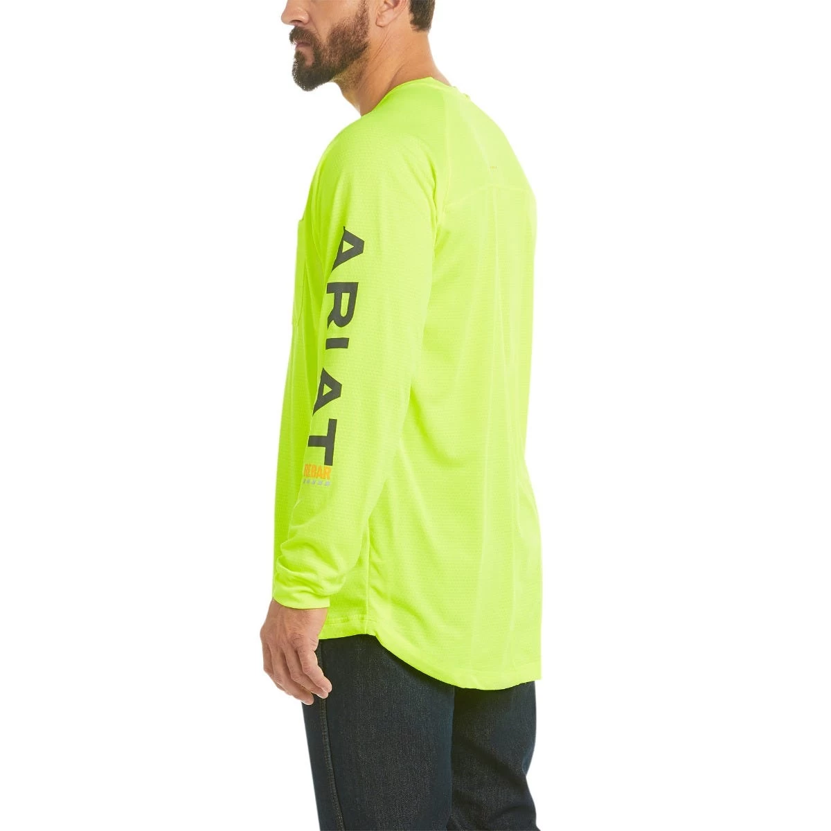 If we had to make one statement about this ~Ariat Rebar Men’s 10031031 Neon Lime HeatFighter Long Sleeve T-Shirt, it might go something like this: it’s comfy, cooling, and captivating. Just look at that neon lime green color!