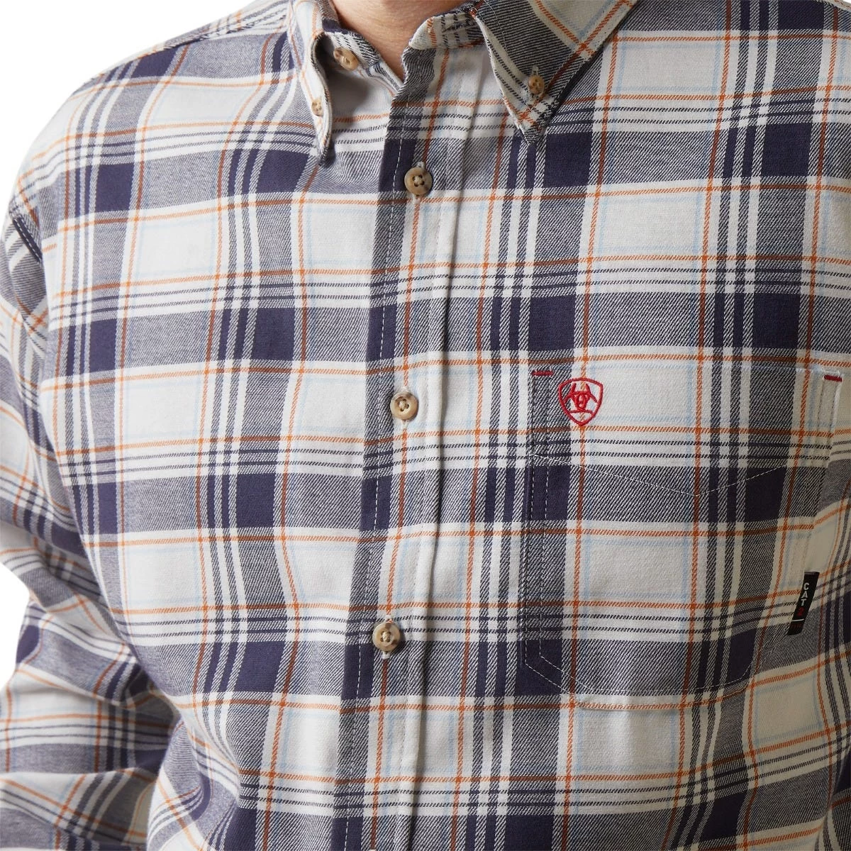 Looking for enhanced freedom of movement? You’ll love the ~Ariat Men’s 10043743 Navy White Plaid FR Chiseled Button Down Long Sleeve Work Shirt from Working Person’s Store! It’s where style meets safety, and every workday becomes a canvas for comfort and confidence. Whether you’re navigating the office, conquering the jobsite, or unwinding after a day well-spent, this men’s button-down shirt is your new versatile attire.