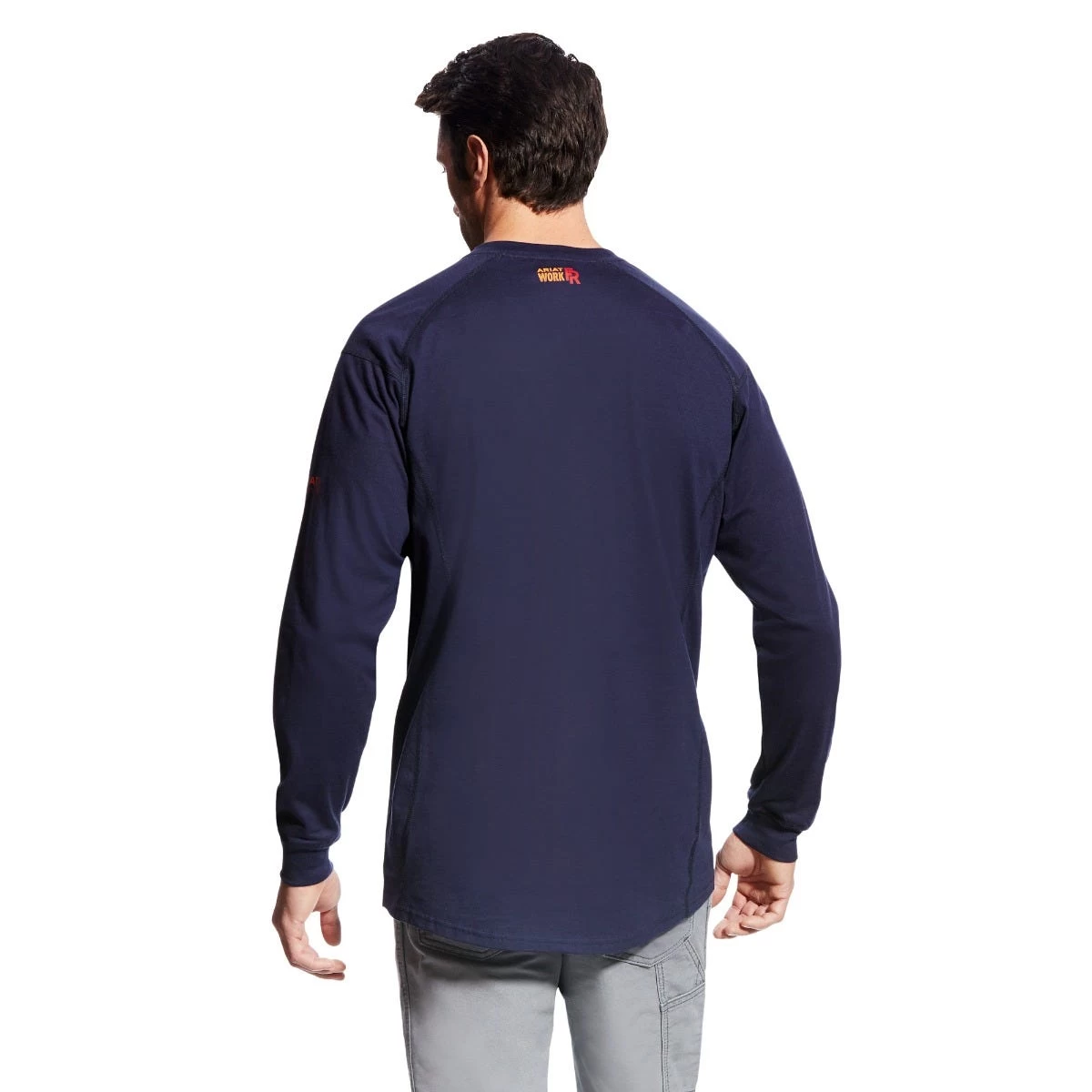 Does your job require lightweight defense against the flames? We have the ~Ariat Work FR Men’s 10022597 Navy Flame Resistant Air Lightweight Long Sleeve Henley Shirt that features both style and safety. This 6-ounce flame-resistant jersey shirt will become your go-to armor against flames, keeping you protected without weighing you down.