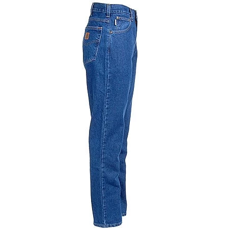 These Carhartt jeans are made from hard-wearing, 15-ounce, 100% cotton denim. This long-established fit consists of a back yoke, a zipper fly, a slim seat, a trim thigh, and 15.75 inch tapered leg openings.
