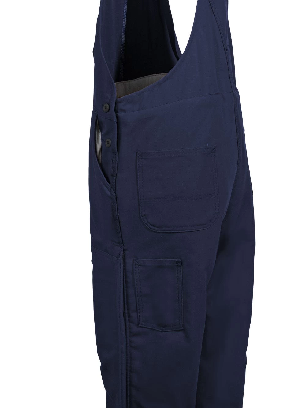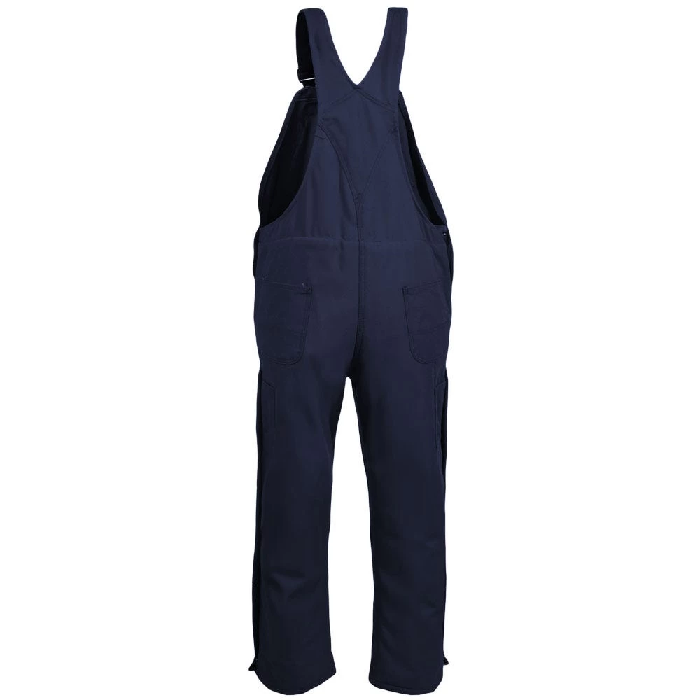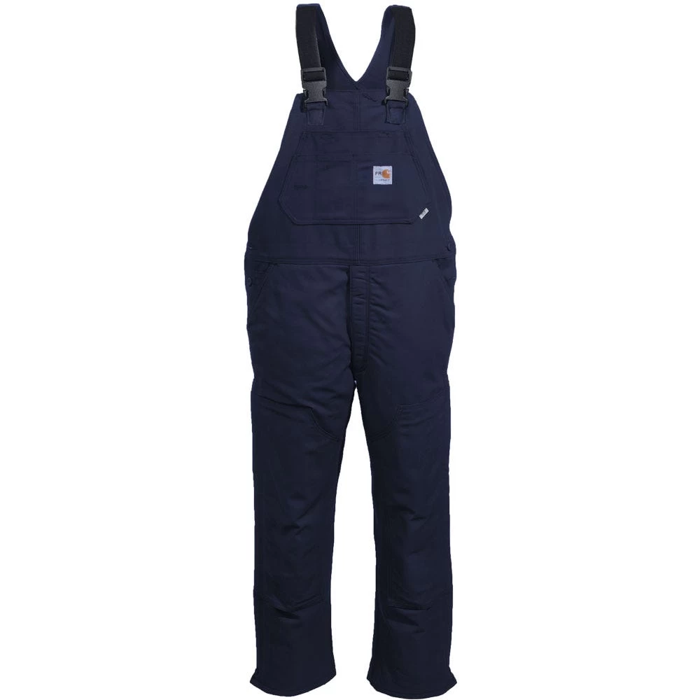 These Carhartt 101626 410 Men’s Navy Blue Flame-Resistant Quilt-Lined Cotton Duck Bib Overalls are made to go on over your clothes, so order them a size or two larger to get the best fit.