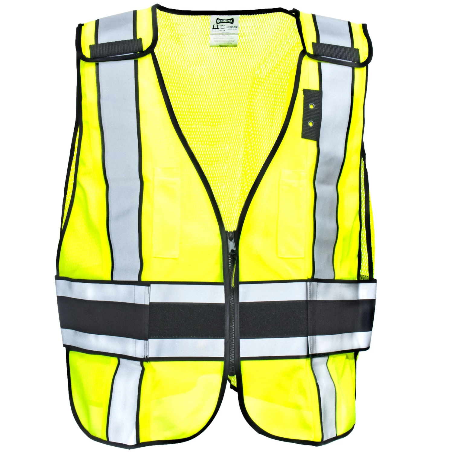 Yet the features of this water-resistant Occunomix vest don’t stop there. To give you a comfortable ergonomic fit, this stain-resistant garment was designed with an adjustable waistband. This hi-viz yellow vest also features a 5-point breakaway zipper with a loop closure and a quick release. That closure combines with two microphone tabs and a two-pen/badge holder pockets to give you on-the-job practicality. We should also not forget to add that this oil-resistant vest is perfect for the warmer months because of the rugged mesh being extremely breathable, too.