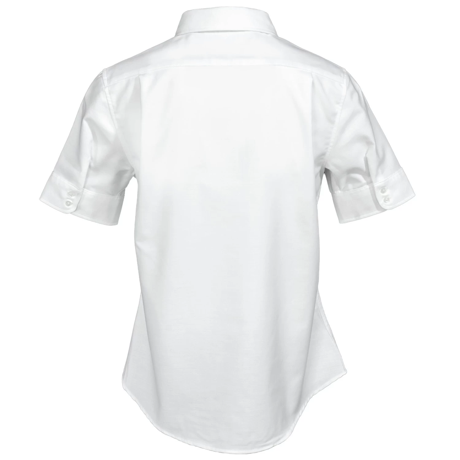 The open collar and full front button-down style of this ladies’ SuperPro oxford shirt is finished with a soft hand and wrinkle-free finish on the cotton blend. The 4.6-ounce 60% cotton and 40% poly material is lightweight and high performance. Independent lab tests have proven that this blend resists soils and releases stain easily in the wash, which is really important to consider when purchasing a white shirt. The bust darts ensure a cut that compliments a feminine figure without leaving unbecoming gaps anywhere in the short-sleeve shirt. Tuck it in or leave it out, the scooped hemline of this ladies’ button-down shirt looks great either way.