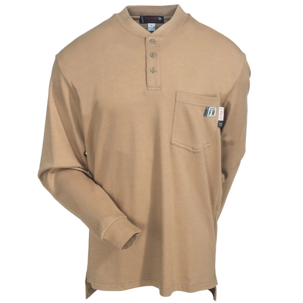 This khaki shirt is made from 220 gsm 100% flame-resistant interlock knit cotton. This soft and protective material is sewn together with 6.5-ounce Aramid high-tenacity, flame-resistant thread. Aramid thread is not only fire-resistant, but it also has superior strength and durability. This Henley-style Wolverine shirt is easy to get on and off with the flame-resistant plastic buttons on the front placket. The fire-resistant ribbed collar and cuffs on this men’s shirt add comfort and protection. Wolverine’s FireZerO clothing meets the strictest global flame-resistant criteria. This includes the following standards: HRC2, Arc rating ATPV 11, 8cal/cm2, NFPA 70E-2004, NFPA 2112-2012, OSHN 29, CFR 1910.269, and ASTM F1506-2010a.